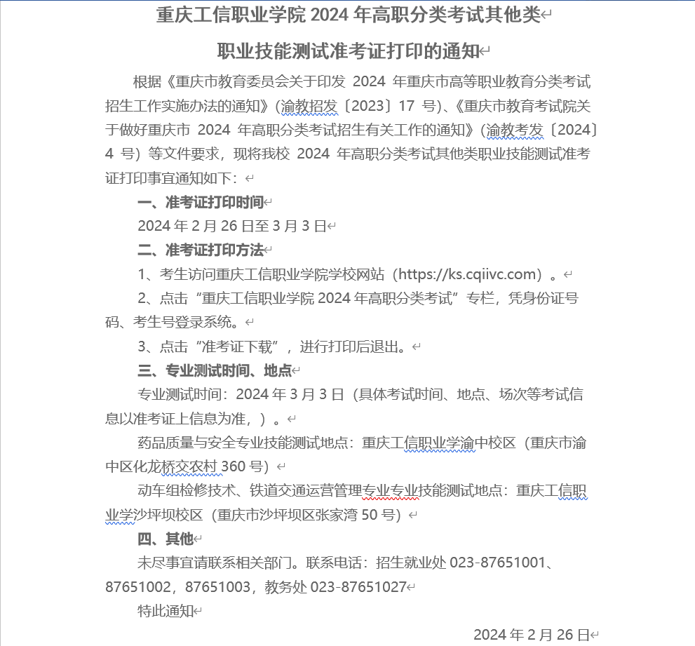 重庆工信职业学院2024年高职分类考试其他类专业职业技能测试准考证打印的通知